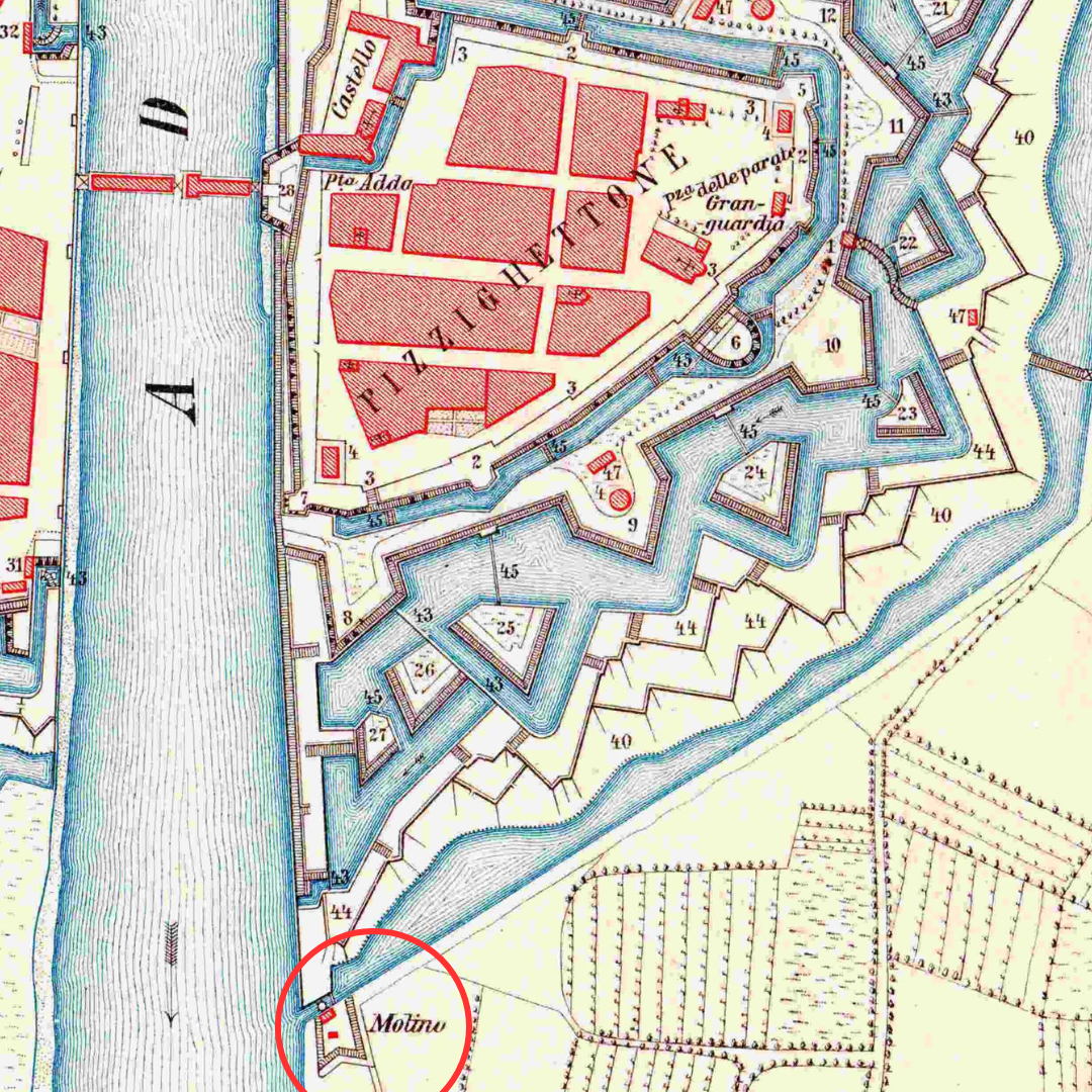 Il mulino ad acqua, già noto ai Romani, ebbe il suo massimo sviluppo nell’alto Medioevo. Sul territorio di Pizzighettone i primi mulini sorsero allo sbocco del colatore Serio Morto nel fiume Adda, sfruttando il dislivello fra i due corsi d’acqua.