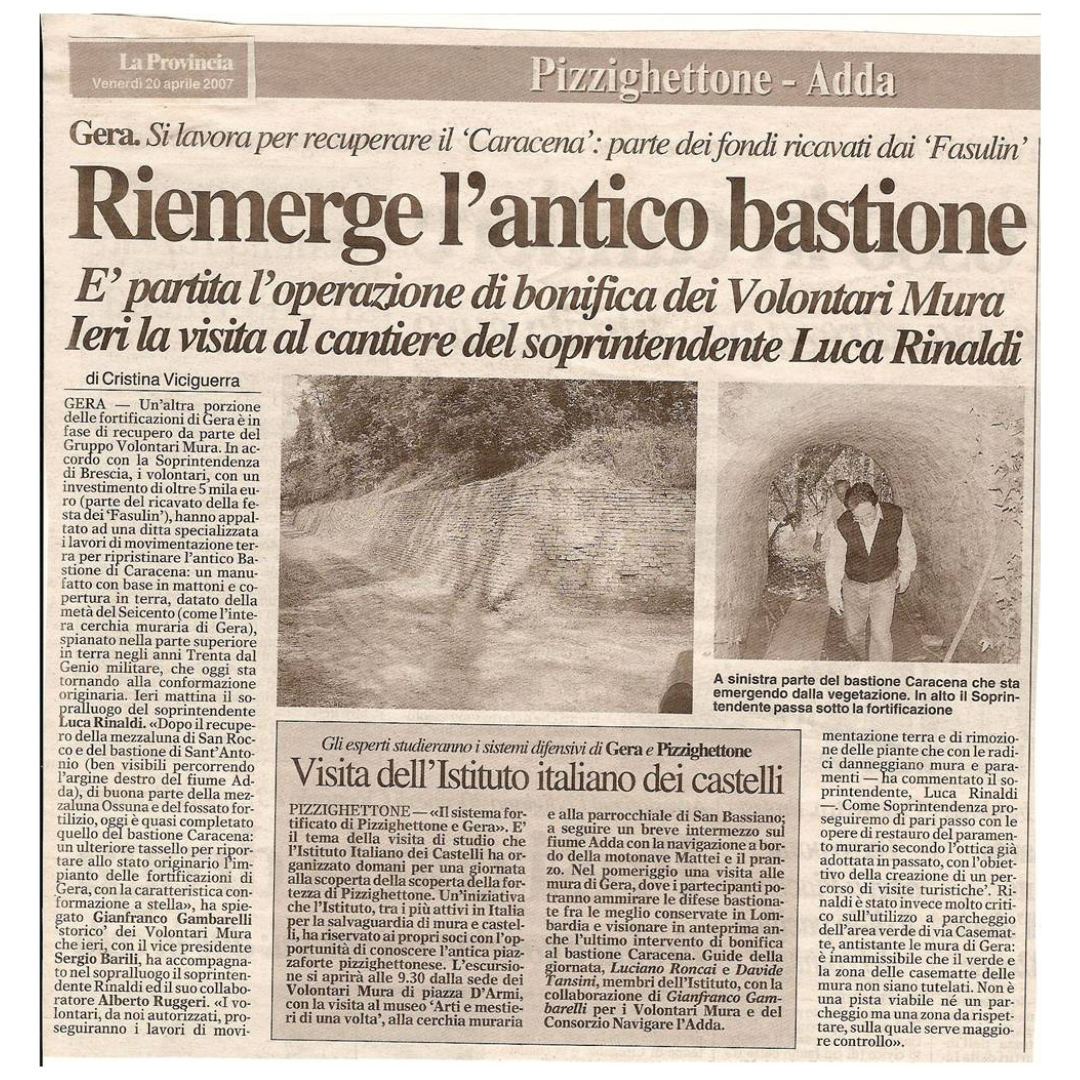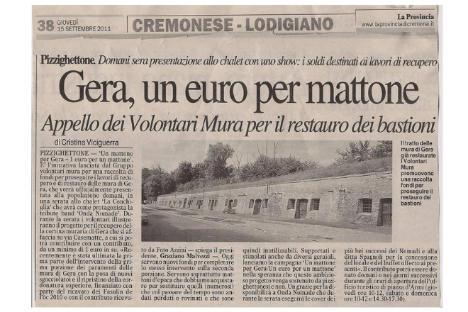 Negli anni 2005-2008, contemporaneamente all'intervento della Soprintendenza ai Beni Architettonici sulla cortina muraria esterna di nord-est di Gera, il Gruppo Volontari Mura ha finanziato la bonifica del fossato da metri cubi di inerti ed il recupero dei “gradoni” all'interno della gola della mezzaluna. All'interno del fossato, dopo aver proceduto ad un disboscamento delle robinie, ha realizzato un tappeto erboso di facile manutenzione.